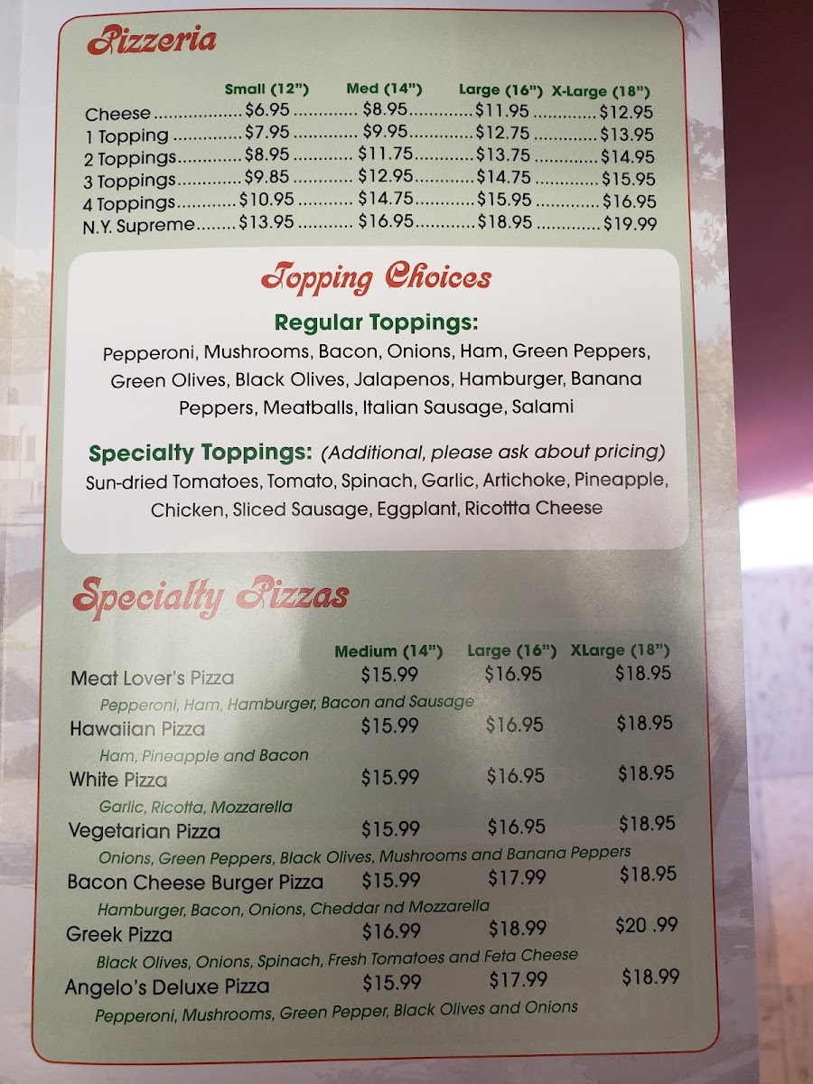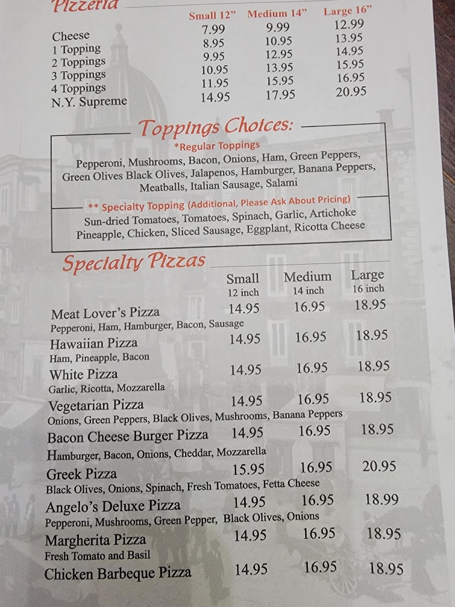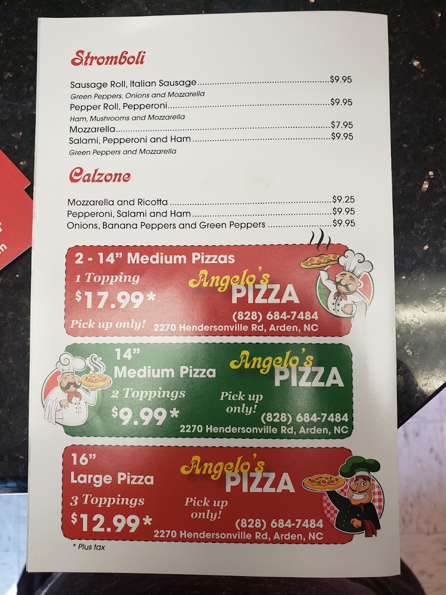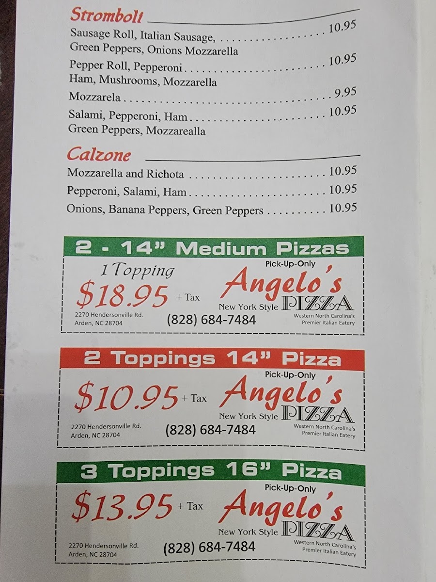 Welcome to Angelo's Pizza, a culinary gem located at 2270 Hendersonville Rd, Arden, NC. Renowned for its authentic New York-style pizza, Angelo's offers a delightful menu that includes a variety of specialty pizzas, including the classic Margherita Pizza and the indulgent Meat Lover's Pizza, each priced at only $14.95. For those who crave variety, their traditional Strombolis and garlic knots provide perfect complements to any meal.